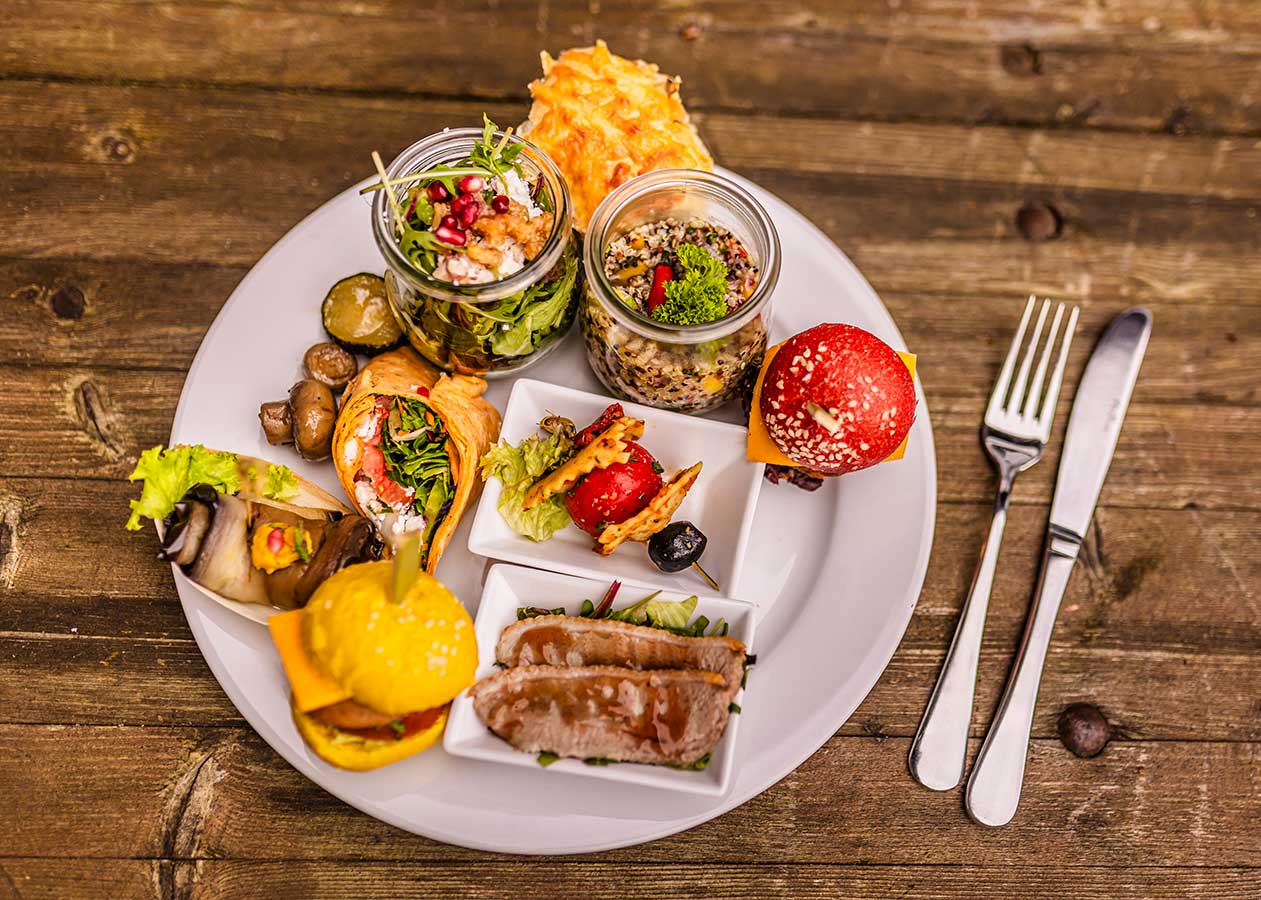 Für uns kein Problem. Da vom Schwein im Stall, dem Rind auf der Weide bis hin zum vollendeten Menü bzw. Buffet alles aus eigener Herstellung stammt, können wir individuell auf Lebensmittelunverträglichkeiten oder den Anforderungen der vegetarischen und veganen Küche eingehen.