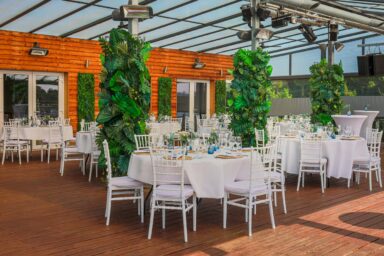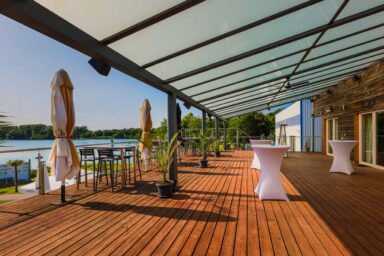 Zusätzlich können in der Lounge und am See freie Trauungen geplant werden. Auch eine Beschallungsanlage ist vor Ort, sodass der Party nichts im Wege steht.