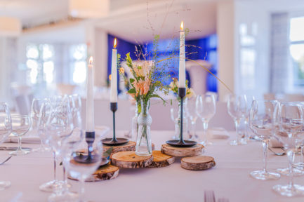 Hergerichtet ist der Saal mit klassischen Bankett Tischen sowie gradlinigen weißen Event-Stühlen.