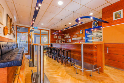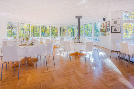 Über eine verspielte Wendeltreppe gelangt man in das Clubhaus welches dank der großzügigen Glasfront regelrecht mit Licht durchflutet wird. Die geräumige Aufteilung sowie der erst kürzlich verlegte Echtholz Parkettboden lassen den Saal klar und einladend wirken.