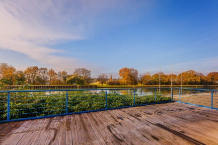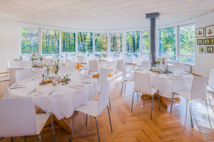Das Clubhaus an den Bootshäusern am Ems-Kanal in Dortmund eignet sich ideal für ausgelassene Feiern. Perfekt für intime Feierlichkeiten mit einzigartigem Ambiente – Zur Ostseite mit Blick in den Wald; zur Westseite mit Blick auf den Ems Kanal.