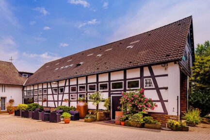 In Zusammenarbeit mit Familie Nordhoff wurde die große Scheune erst kürzlich mit viel Liebe zum Detail renoviert und neugestaltet. Über den alten Steinfußboden im Hof gelangt man durch eine alte Fachwerktür direkt in die große Festscheune. Auf dem Vorplatz lassen sich bei gutem Wetter gemütliche Empfänge sowie Fotoshootings abhalten.