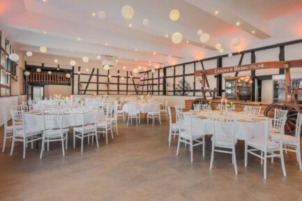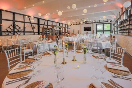 Der geräumige Schnitt der Location als auch der helle Holzfußboden in Kombination mit den naturbelassenen Fachwerkwänden lassen die Location hell und einladend wirken. Aufgrund der gepflegten Außenanlage sind hier besonders BBQ- oder aber Frontcooking-Arrangements beliebt.